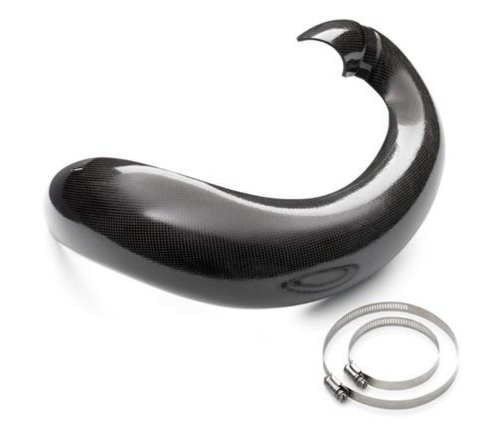 Scut rezonator carbon KTM 250/300 08-16 Datorita marimii generoase a protectiei de carbon KTM , rezonatorul va fi protejat perfect impotriva pietrelor si bolovanilor , a crengilor si a altor obiecte ce il pot indoi . Protectia de carbon pentru rezonator KTM este extrem de usoara, aproximatic cu 80% mai putin decat cel de aluminiu , dar in acelasi timp ofera protectie si viata mai lunga rezonatorului . Protectia pentru rezonator contine colierele pentru montaj . Stiai ca scutul de carbon este foarte stabil , fiind de 4 x mai elastic ca si scutul de aluminiu Nu va rugini niciodata Este rezistent la temperatura inalta , astfel incat nu se va dilata